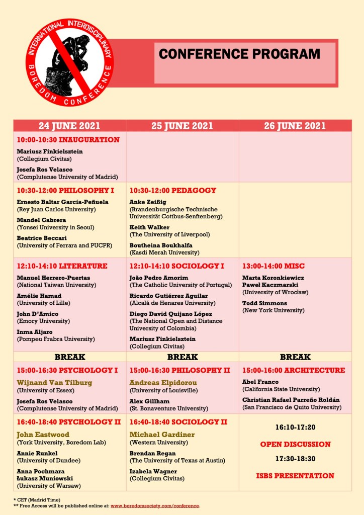 The 4th edition of International Interdisciplinary Boredom Conference is here to come very soon. We are pleased to invite all for online conference experience at GOOGLE MEET. We start 24th June at 10 AM Madrid Time. We are pleased to inform that our keynote speakers are the most prominent experts on boredom: John Eastwood (York University, Canada), Andreas Elpidorou (University of Louisville, USA), Michael Gardiner (Western Ontario University, Canada), and Wijnand van Tilburg (University of Essex, UK). At the conference we have panels on sociology, psychology, philosophy, pedagogics of boredom as well as on literature, architecture and open session. Full programme is available at the new conference webpage. The conference is organized – for the first time – by newly-founded International Society of Boredom Studies.