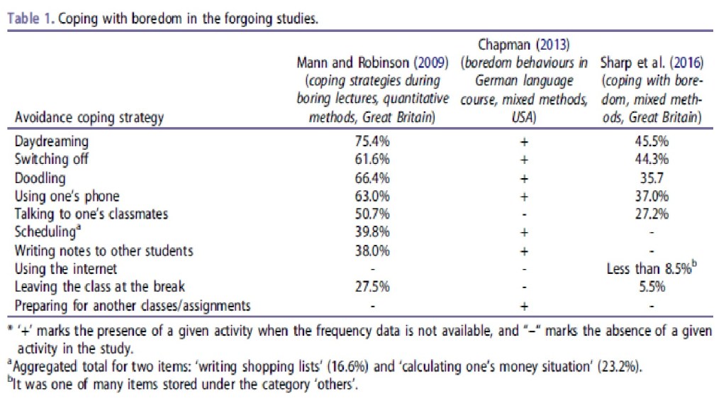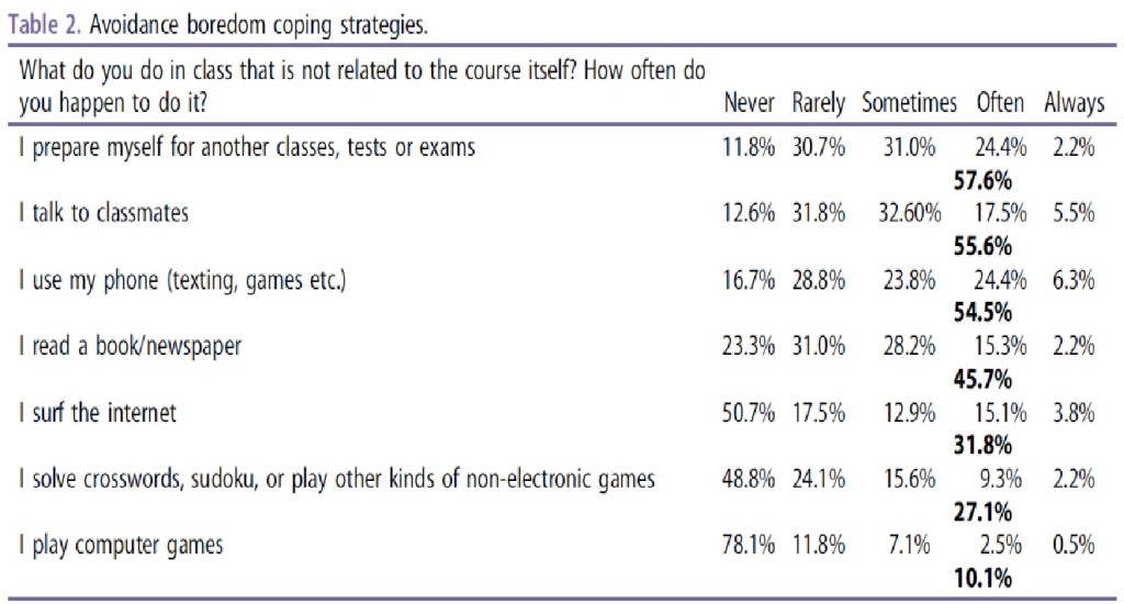 Based on: Finkielsztein, M. (2020). Class-Related Boredom among University Students: A Qualitative Research on Boredom Coping Strategies. Journal of Further and Higher Education, 44(8), 1098-1113.