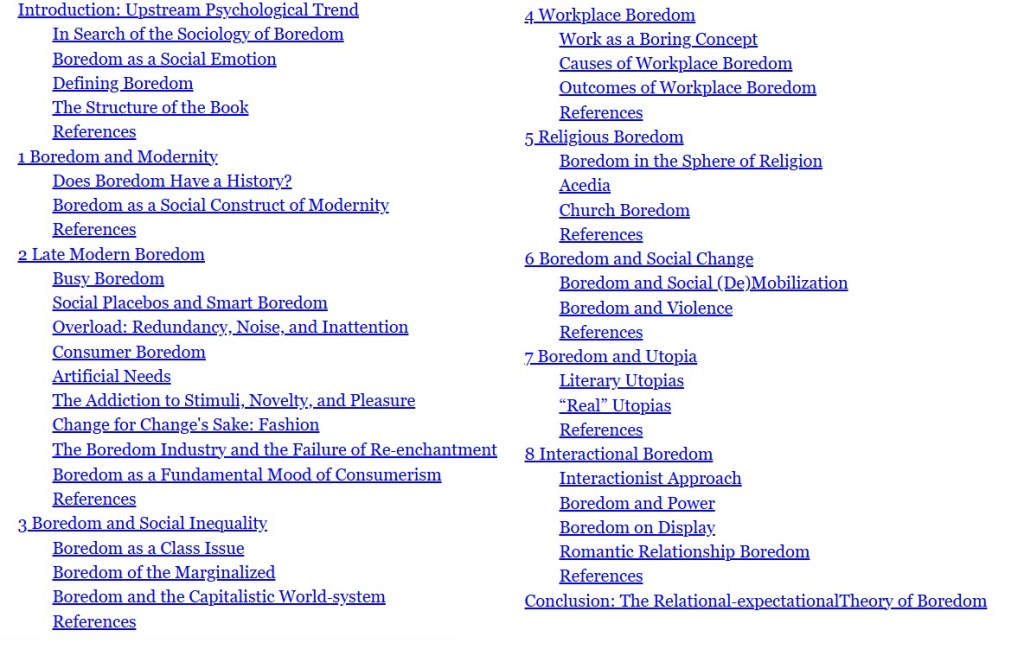 My second book summarises 13 years of researching and theorizing about boredom. It adds a sociological perspective to boredom studies, analyzing boredom from various vantage points and touching upon different spheres of social life to propose relational-expectational theory of boredom.